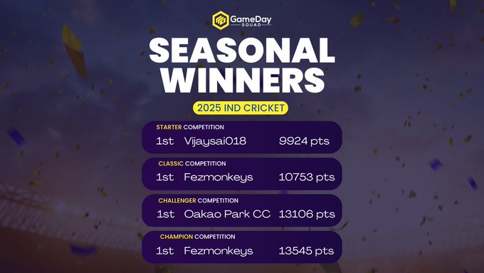 A massive congratulations to VijaySai08, Oakao Park CC, and Fezmonkeys for taking out 1st place in our 2025 IND Cricket competitions
