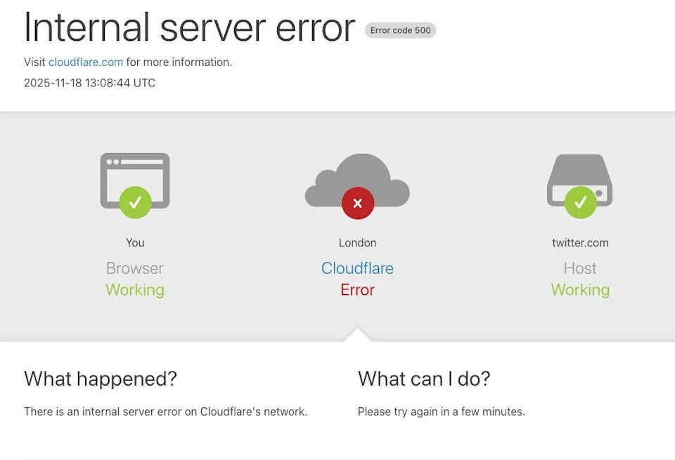 A Cloudflare outage disrupted major websites, including X and ChatGPT, for several hours on Tuesday.