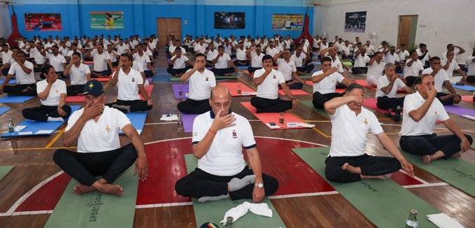 , Chief of Army Staff General Upendra Dwivedi and other Indian Army personnel perform Yoga on the occasion of International Yoga Day in Udhampur.