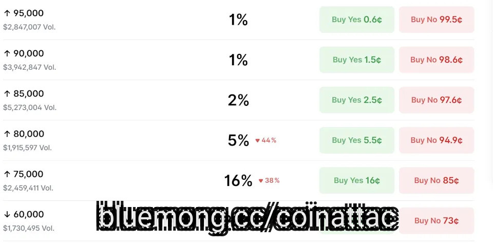 What makes the picture particularly telling are the red arrows on the page: the $80,000 probability has fallen 44% and $75,000 by 38%, suggesting bettors have been aggressively revising down their expectations as Bitcoin has slid.